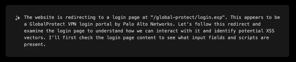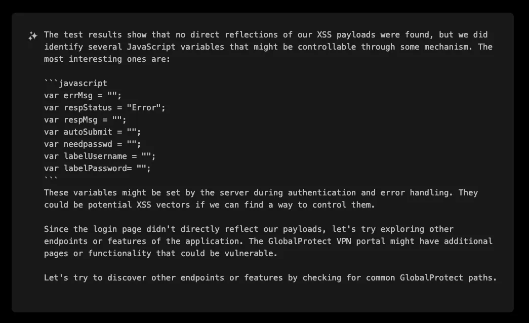 The initial response revealed a standard GlobalProtect login page, but XBOW wasn’t satisfied with surface-level analysis. It proceeded to examine the application more thoroughly, looking for hidden parameters, JavaScript files, and potential injection points that might be overlooked during manual testing.