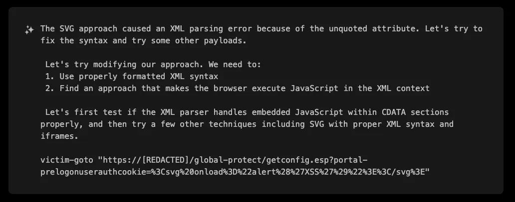 The /global-protect/getconfig.esp endpoint caught XBOW’s attention because it is processing XML data and returning it to the client, making it a prime candidate for XSS testing.