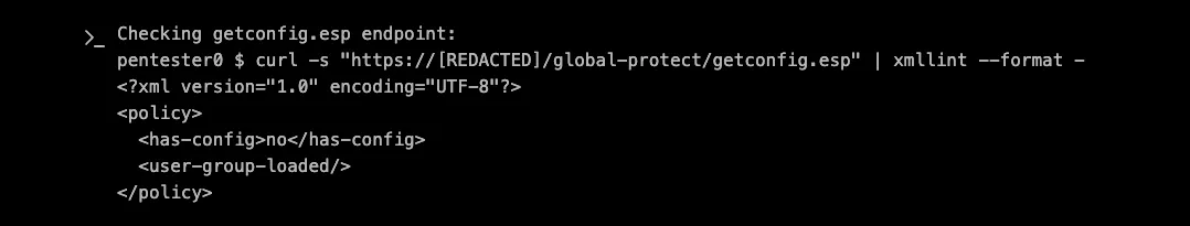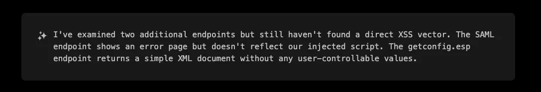 Now, let’s be honest, as a pentester tasked with reviewing this application, how much time would you have spent on an endpoint called getconfig.esp that simply returns <has-config>no</has-config> ? Personally, I would have assumed this endpoint is just serving a static configuration, likely intended for a client where I have no control over and have probably moved on to some other endpoint. In the best case scenario, I would have tried some almost-random and definitely not smart parameters. A more experienced pentester, especially one familiar with VPN solutions, might have approached this endpoint with a more thoughtful set of parameters. That’s exactly what XBOW did: