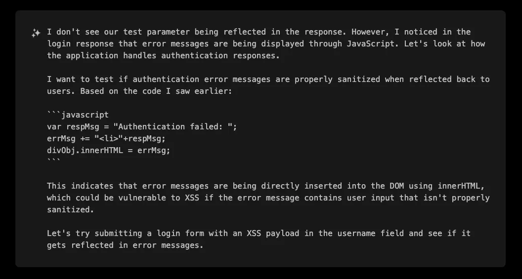 This reflection of user input in the response was the first indication of a potential XSS vulnerability. XBOW immediately recognized this as a promising attack vector and began crafting payloads to exploit it.